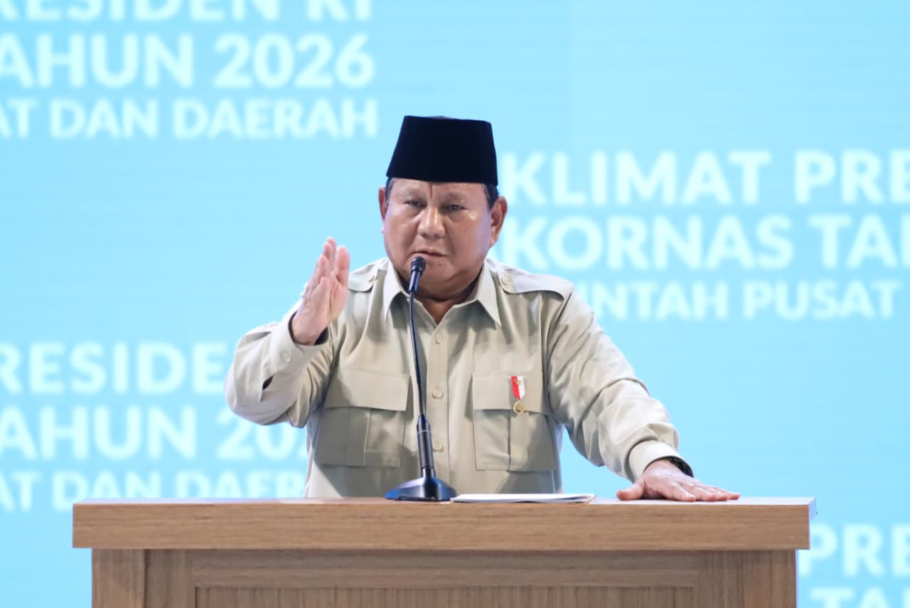 Gubernur Aceh, H. Muzakir Manaf bersalaman dengan Presiden RI Prabowo Subianto, saat mengikuti Rakornas Pemerintah Pusat dan Daerah Tahun 2026, di Sentul International Convention Center (SICC), Bogor, Jawa Barat, Senin (2/2/2026).