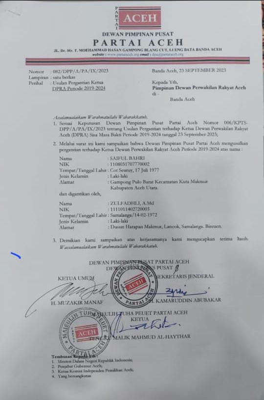 Hal itu berdasarkan surat 083/DPP/A/PA/IX/2023, tanggal 23 September 2023, yang ditandatangani langsung oleh Ketua Umum Partai Aceh (PA) Muzakir Manaf alias Mualem.Surat tersebut diserahkan oleh Wakil Ketua PA Bidang Organisasi dan Keanggotaan Faisal Saifuddin kepada pimpinan DPRA, Safaruddin pada Senin (25/9/2023) pagi.