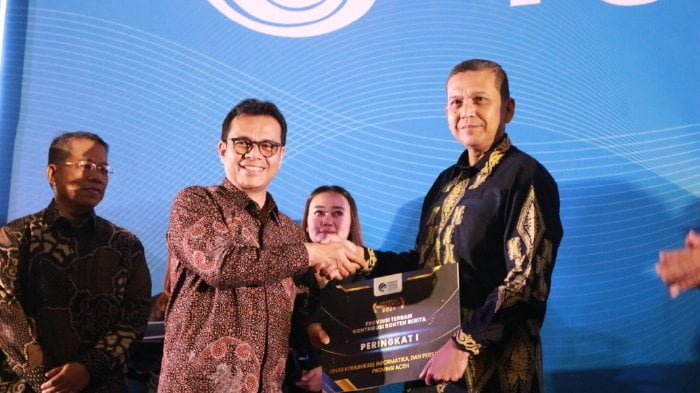 Penghargaan diserahkan langsung oleh Wakil Menteri Komunikasi dan Informatika Nezar Patria kepada Dinas Komunikasi Informatika persandian Aceh, Marwan Nusuf mewakili Pj Gubernur Aceh serta didampingi Kepala Bidang Pengelolaan Komunikasi Publik Alfajrian AB.