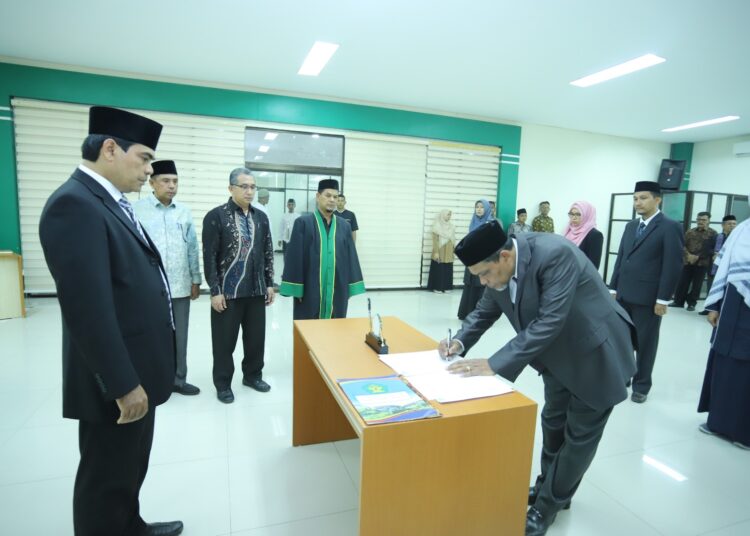 Prosesi pelantikan, pengambilan sumpah jabatan dan penandatanganan berita acara digelar di Ruang Sidang Lantai III Gedung Rektorat UIN Ar-Raniry Banda Aceh.